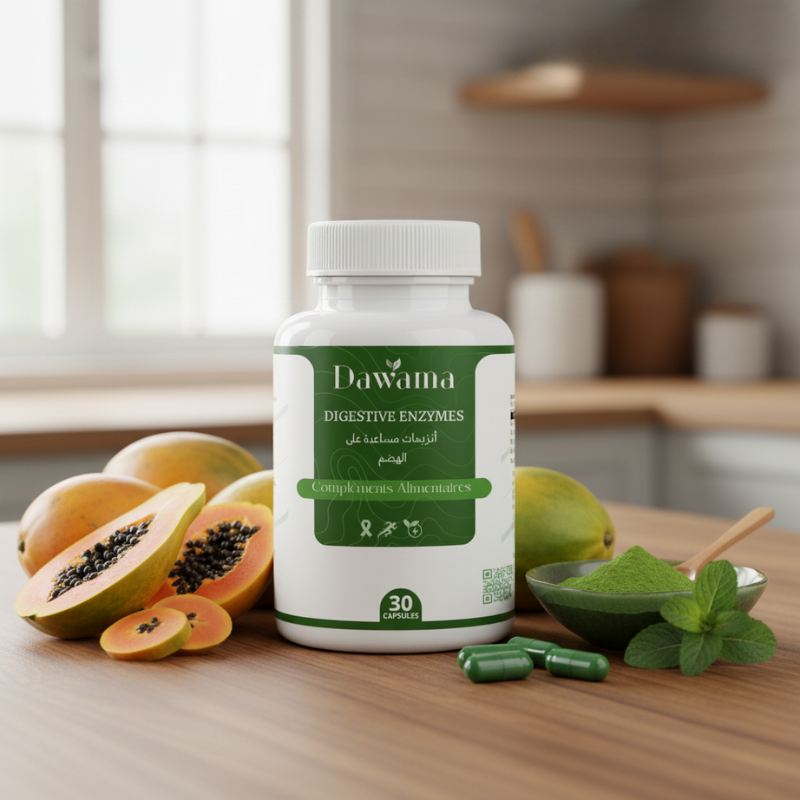 وصف: مكمل غذائي مصمم لدعم صحة الجهاز الهضمي من خلال تعزيز عملية الهضم وامتصاص العناصر الغذائية بكفاءة. يحتوي على مزيج من الإنزيمات الهاضمة التي تساعد في تقليل الانتفاخ وتحسين راحة المعدة.